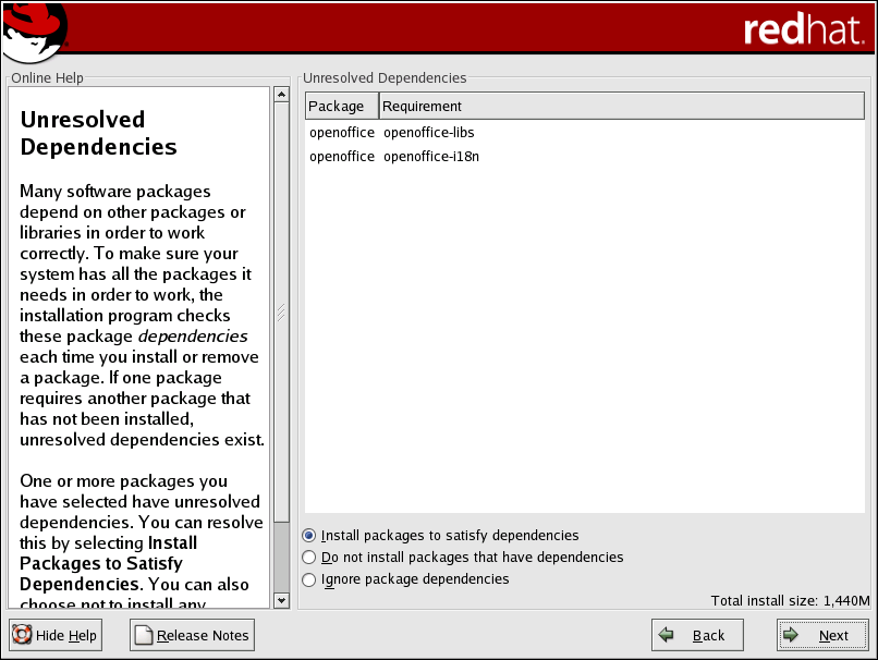 The Unresolved Dependencies screen appears only if you are missing packages that are needed by your customized package selection.