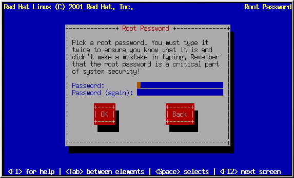The installation program will prompt you to set a root password[1] for your system. You must enter a root password. The installation program will not let you proceed to the next section without entering a root password.