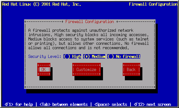 No firewall provides complete access to your system and does no security checking. Security checking is the disabling of access to certain services. It is recommended that this only be selected if you are running on a trusted network (not the Internet), or if you plan to do more detailed firewall configuration later.
