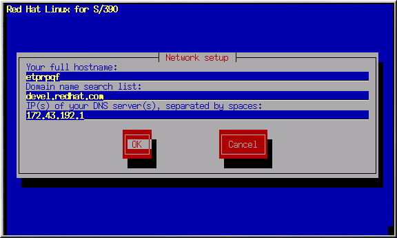 The IP address of your network connection is already set up at this point from the boot stage of the installation process. This step requires additional network information, such as, the hostname, domain name search, and the IP address of the domain name servers. If more than one item is provided in the domain name search or DNS fields, please separate them by spaces.