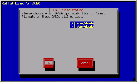 After the kernel loads the DASD driver and detects your DASD devices, you will be asked to format them. All newly created partitions should be formatted. In addition, any existing partitions that contain data you no longer need should be formatted. The DASD format program will format all selected DASD's simultaneously, therefore the formatting should only take a as long as the largest DASD partition. Note: A 2 GB DASD partition could take upwards of 20 minutes to complete.