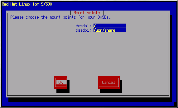 At this point, you must tell the installation program where to install Red Hat Linux. This is done by defining mount points for one or more disk partitions in which Red Hat Linux will be installed. One of the DASD's must be specified as the root partition (i.e. a mount point of /). Because the DASD partitions are usually small (e.g. ~ 2 GB's) it is recommended mount points of / and /usr/share be used (refer to Figure 3-4). It is also recommended data partitions be specified (i.e data partition mount points /home and /usr/local).