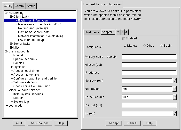 The first item on this screen is a check box to indicate whether this adaptor is enabled or not. It should be checked if this is the one you intend to use. Below that is a choice of Config modes. Manual means that you will be providing all the information and entering it yourself. Dhcp and Bootp mean that your machine will be getting its network configuration information from a remote DHCP or BOOTP server. If you're not sure what option to choose, talk to your network administrator.