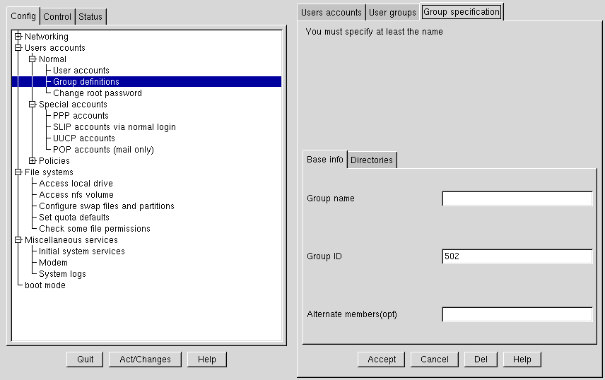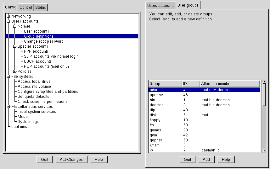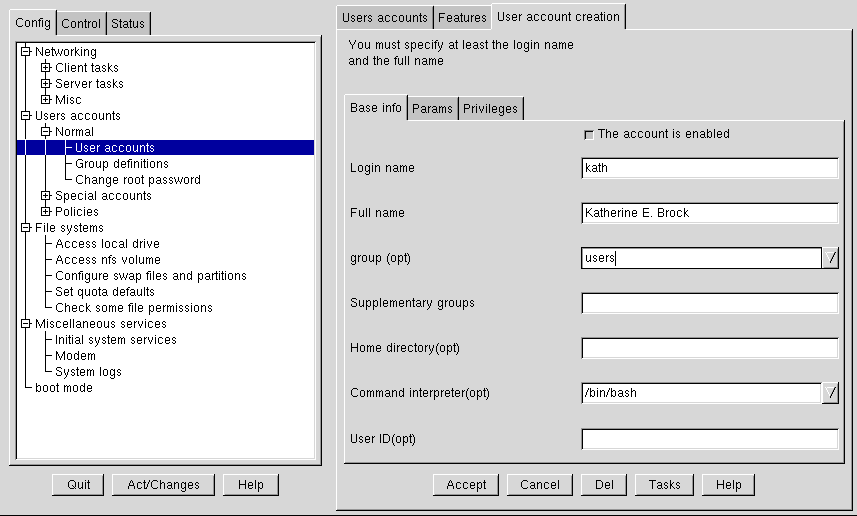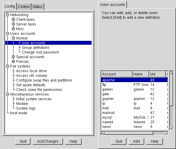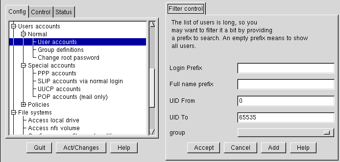 Open Config => Users accounts => Normal => User accounts. Linuxconf may show you a filter screen (see Figure 3-2).