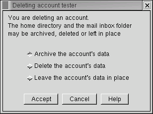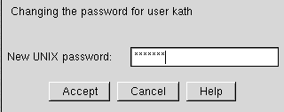 Linuxconf will prompt you to enter the new password. There is also a field called Confirmation where you will need to type the password again. This is to prevent you from mistyping the password. See the section called Adding a User Account for guidance on choosing a password. If you decide against changing the password, select Cancel. Once you have entered the new password select Accept.