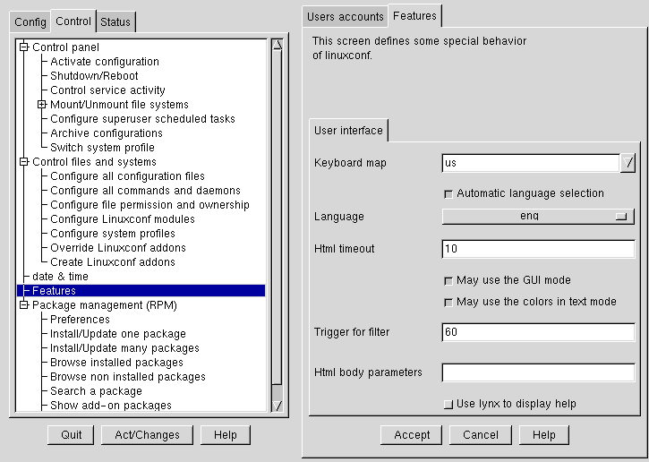 While linuxconf can do nearly everything the control panel tools can, there are two areas in which the control panel still holds the upper hand: