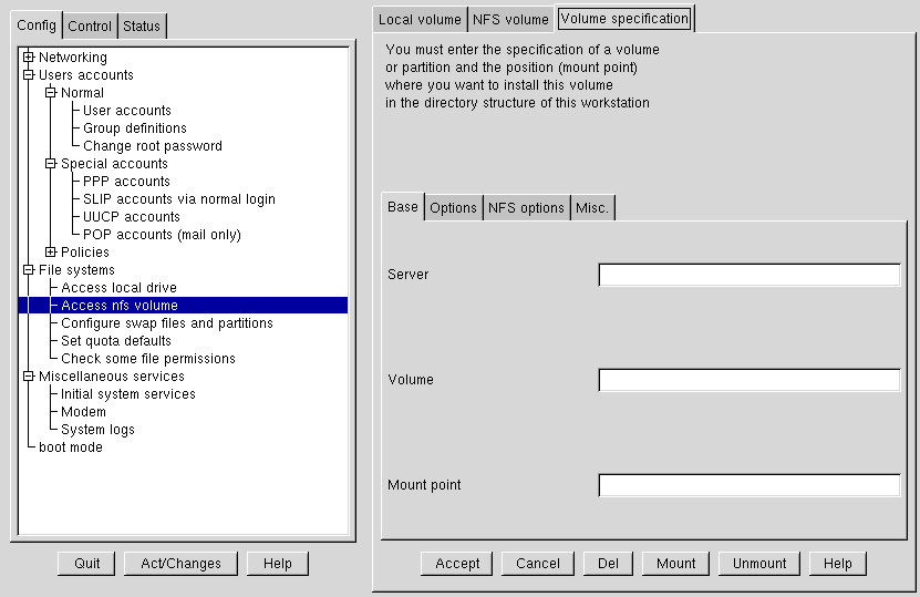 This is all you need to get the mount created. Linuxconf will update your /etc/fstab file accordingly. If you are aware of additional requirements, please read the help file on the Volume specification screen and see the mount man page for more information.