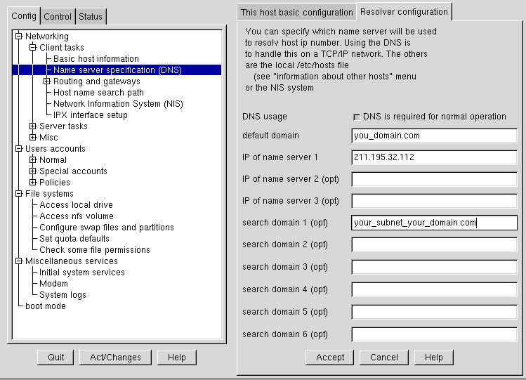To specify the nameserver, open Config => Networking => Client tasks => Name server specification (DNS).