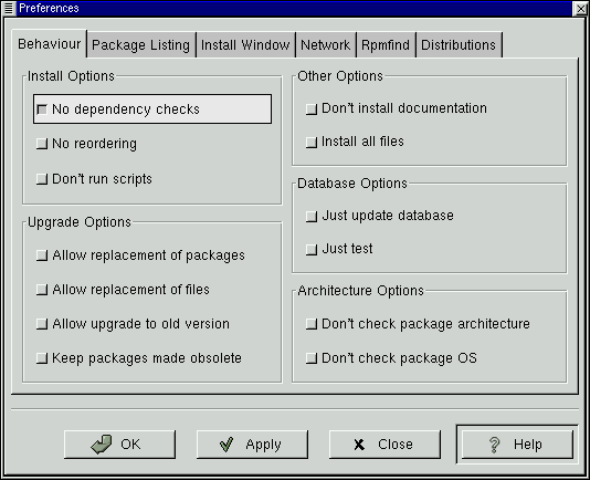 Under the Behavior tab, you'll find a number of options for configuring the way Gnome-RPM installs, uninstalls and upgrades packages. The Behavior tab is split into five sections: Install, Upgrade, Other, Database and Architecture. Note that by default these boxes are not checked (see Figure 6-5).