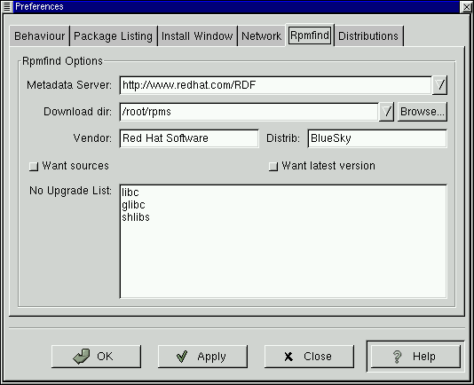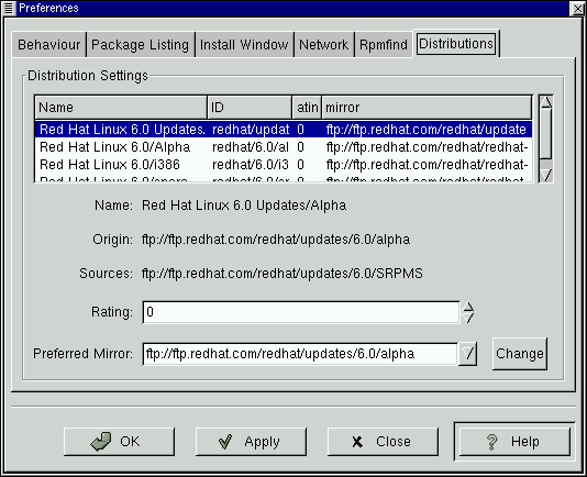 In Distribution Settings, you can set the options for choosing the most appropriate package out of the selections Rpmfind returns, as well as which mirror you would like to use. The higher the rating you indicate for your selection (as shown in Figure 6-9) the higher the priority it will receive; the lower rating, such as "-1," will specify that packages not be recommended.