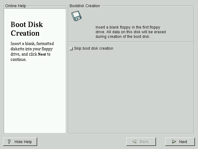 After a short delay, your boot disk will be created; remove it from your floppy drive and label it clearly. Note that if you would like to create a boot disk after the installation, you'll be able to do so. For more information, please see the mkbootdisk man page, by typing man mkbootdisk at the shell prompt.