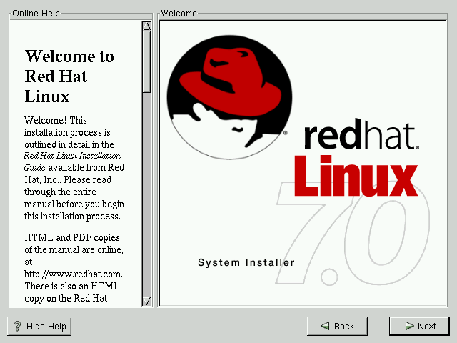 The Welcome screen (see Figure 15-5) does not prompt you for any installation input. Please read over the help text in the left panel for additional instructions and information on where to register your Official Red Hat Linux product.