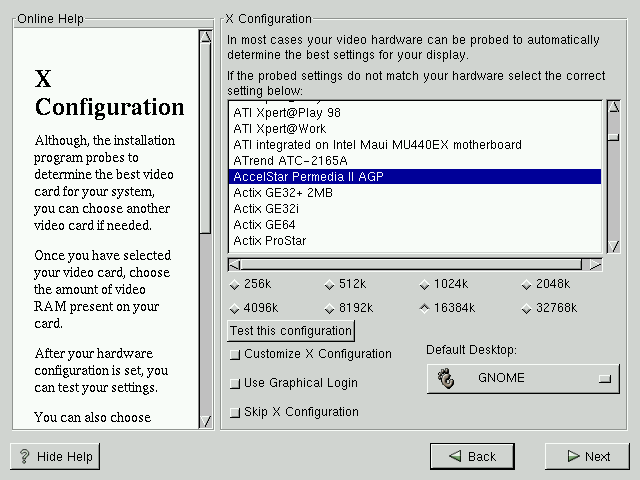 Next, Xconfigurator prompts you for the amount of video memory installed on your video card. If you are not sure, please consult the documentation accompanying your video card. You will not damage your video card by choosing more memory than is available, but the XFree86 server may not start correctly if you do.
