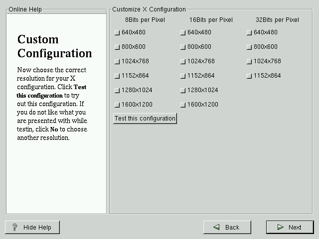If you would like to customize the X configuration, please make sure the Customize X Configuration button is selected. If you choose to customize, you will be presented with another screen that lets you select what your resolution should be (see Figure 15-26). Again, you will have the option of testing the configuration.