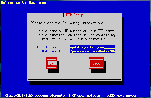 Enter the fully-qualified domain name or IP address of the FTP site you are installing from, and the name of the directory there which contains the RedHat installation files for your architecture. For example, if the FTP site contains the directory /pub/mirrors/redhat/i386/RedHat, enter /pub/mirrors/redhat/i386.