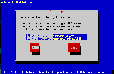 If the NFS server has the Red Hat Linux CD mounted on /mnt/cdrom, enter /mnt/cdrom in the Red Hat directory field. If the NFS server is exporting a mirror of the Red Hat Linux installation tree instead of a CD, enter the directory which contains the RedHat directory. For example, if your NFS server contains the directory /mirrors/redhat/i386/RedHat, enter /mirrors/redhat/i386.