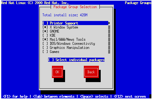 Note that some packages that are required for every Red Hat Linux system (such as the kernel and certain libraries) do not appear in the package selection dialogs.