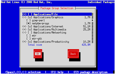 To see the list of packages in the Applications/Editors category, for example, use the arrow keys to select this group and press Enter or Space. When you do, the + sign (closed) changes to a - sign (open) and a list of packages in this category appears. An * appears beside currently selected packages. Press the Enter or Space keys to select or deselect packages.
