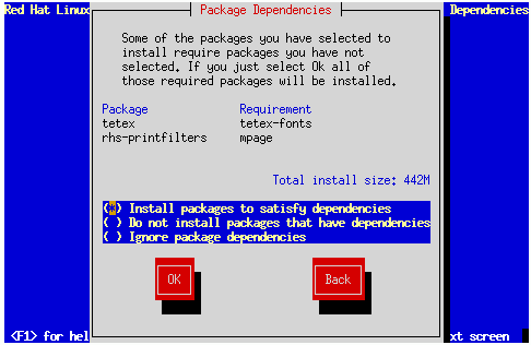 After you have finished selecting packages to install, the installation program checks the list of selected packages for dependencies. If any package requires another package which you have not selected to install, the program presents a list of these unresolved dependencies and gives you the opportunity to resolve them (see Figure 14-36). If you simply press OK, the program will resolve them automatically by adding all required packages to the list of selected packages.