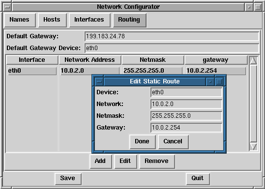 In the Routes management screen you have the ability to add, edit, or remove static networking routes. Adding or editing an entry involves identical actions, just like the Hosts panel. An edit dialog box will appear; simply type the new information and click Done when you are finished. See Figure 3-28 for an example.