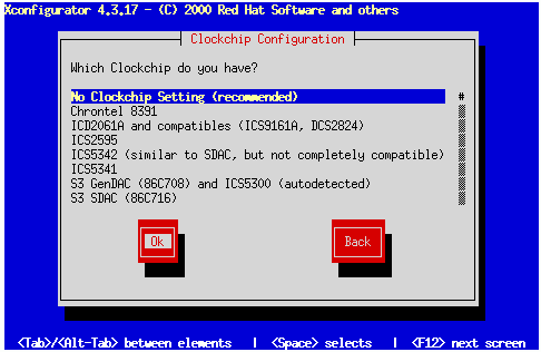 Next, choose a clockchip setting if your video card supports it (if it has one). The recommended choice is No Clockchip Setting, since XFree86 can automatically detect the proper clockchip in most cases.