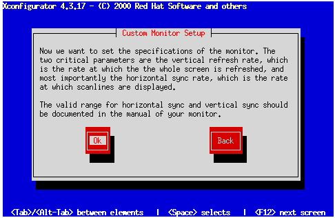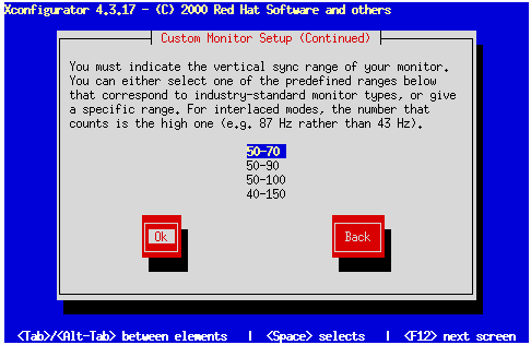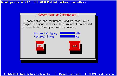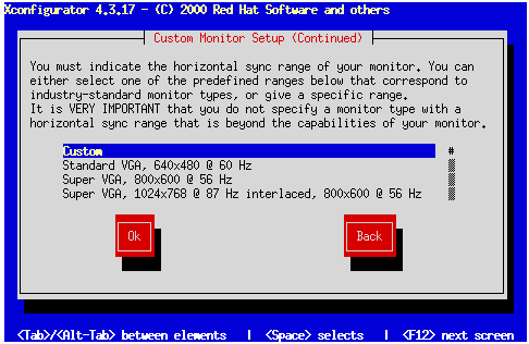 If you select Custom, Xconfigurator prompts you to select the horizontal sync range and vertical sync range of your monitor (these values are usually available in the documentation which accompanies your monitor, or from your monitor's vendor or manufacturer).