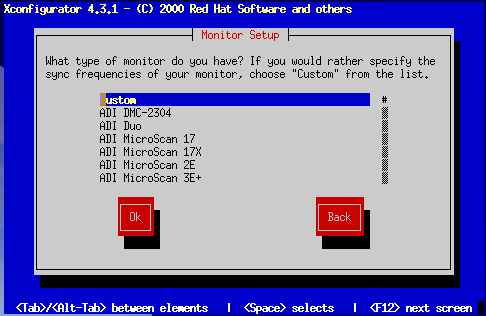 First, Xconfigurator presents a list of monitors (see Figure 14-43). If your monitor is listed, select it and press Enter. Otherwise, select Custom.