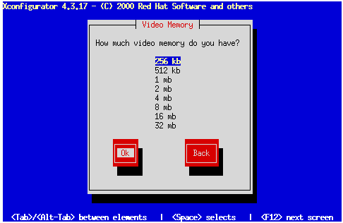 If you are not sure how much memory your card has, consult the documentation accompanying your video card. Choosing more memory than is present in your card will not damage it, but may cause the XFree86 server to start incorrectly.