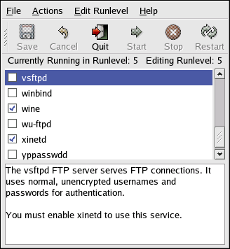 Red Hat Linux ships with three programs designed to switch services on or off. They are Services Configuration Tool, ntsysv, and chkconfig. For information on using these tools, see the chapter titled Controlling Access to Services in the Official Red Hat Linux Customization Guide.