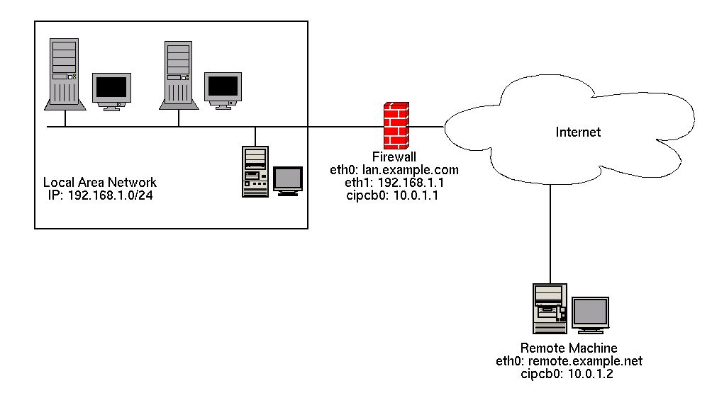 CIPE is a VPN implementation developed primarily for Linux. CIPE uses encrypted IP packets that are encapsulated, or "wrapped", in datagram (UDP) packets. CIPE packets are given destination header information and are encrypted using the default CIPE encryption mechanism. The packets are then transferred over IP as UDP packets via the CIPE virtual network device (cipcbx) over a carrier network to an intended remote node. The following figure shows a typical CIPE setup connecting two Linux-based networks: