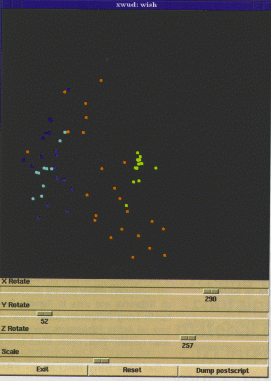 This program reads in a datafile consisting of 3D coordinates, one per point. Each point is also assigned a "type", which is an integer from 0 to 6. Each point is given a simple 3D-to-2D transformation and plotted with a different color, based on the type. A wish canvas widget is used to do the plotting; wish provides scrollbars to allow you to rotate and scale the dataset. Figure 1 (above) shows what the program looks like on a sample dataset of about 70 points.