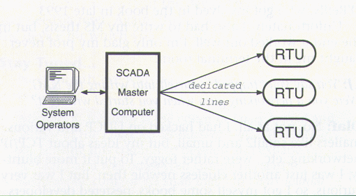 At Virginia Power, the standard medium of communication between RTUs and SCADA master computers is the dedicated serial line, often leased from the local phone company. Several RTUs can be multi-dropped off a single dedicated line (up to 16, a limitation imposed by our currently-used SCADA protocol), but geographical limitations tend to prevent as much sharing of dedicated lines as might be desirable. At the risk of over-simplifying, we can imagine one dedicated line per RTU, giving us a traditional SCADA system something like that shown in Figure 1 (see below).