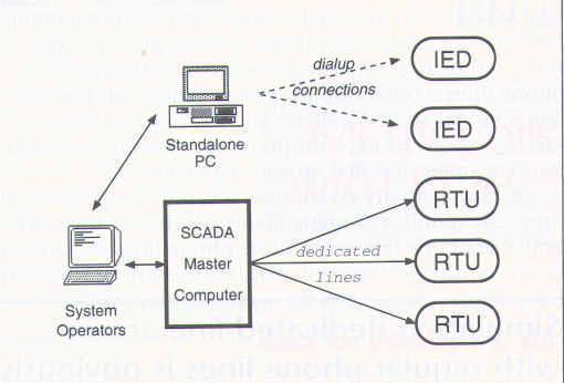 Such a hybrid system, while it may provide (in one form or another) all necessary data and control capabilities, fails to provide the system operators with a unified picture of the system they are operating. These folks have enough responsibility on their hands without having to run through mental gyrations along the lines of: "I'd better check the voltages in the Berry district. Oops--the Cranberry substation has to be dialed, so I'll just walk over here to the dialup PC and...oh, heck. Ted's using the PC to dial the Mineral Water substation! Guess I'll try later..."
