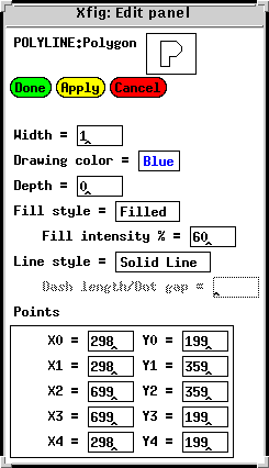 The box is blue, as is the lower box, but the intensity is 60%, while the lower box is 95%. Using the edit panel, the color could be changed to seven others (counting black and white) and the intensities can be varied. The point box shows the x and y coordinates. Each value may be changed by editing the boxes. For other shapes, such as a polyline (made of a connected series of line segments), individual points can be moved, subtracted or added to change the shape of the line.