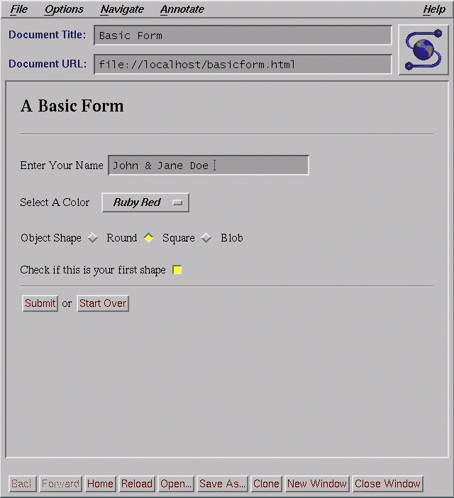 Of particular note are the submit and reset input types. Clicking on submit causes the form contents to be transmitted to the server, and then to the ACTION program for processing. The reset button causes the form elements to be set to their initial values, allowing the user to easily return the form to its initial state.