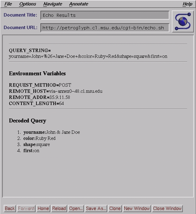 The response is to echo the encoded query, some of the environment variables, and the decoded content of the query. This program is useful as a test program when creating new forms, and as a base for building other CGI scripts. Figure 2(135K) displays the results of posting the form shown in Figure 1 to this script.