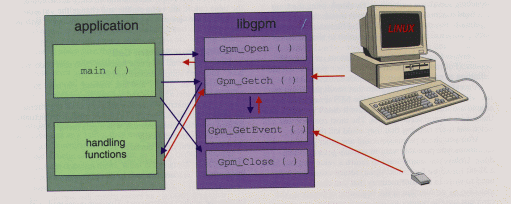 Many screen-oriented applications, on the contrary, spend most of their time waiting for user input, and could well benefit from the functions in libgpm. Externally, Gpm_Getc() and its relatives behave just like the originals when keyboard events are received; internally, they can receive mouse events and handle them through a user-defined function.