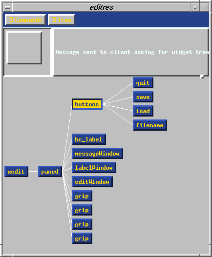 All widgets are laid out in a tree-like fashion, with the parent widgets on the left, and their children progressing to the right. Lines connect children to parents. You can use the box in the upper-left corner of editres to move the display around if the widget tree is larger than the window itself.