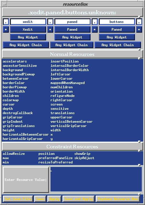 Resources, and the widgets they modify, have a hierarchical nature. "What's a widget?" you ask. Widgets are the basic building blocks, or objects, of X programs. Some example widgets with which everyone is familiar: scrollbars, text-entry fields, buttons, and checkboxes. In the above resource, the Label widget is a "child" of the Paned widget, which is a "child" of Xedit. This will become more clear when the editres program is introduced below.