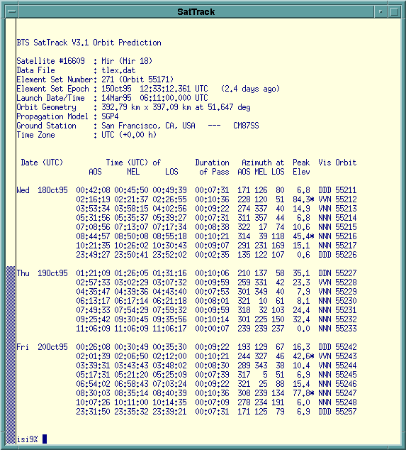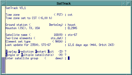 Exec "SatTrack" exec /usr/bin/X11/color-xterm -sb -sl 500 -j -ls -fn 7x14 -geometry 132x26 -T 'SatTrack for Unix 3.1' -n 'SatTrack' -e /usr/local/bin/X11/SatTrack/run/sattrack &Using SatTrack is straightforward. After telling the program your location and the satellite you're interested in, you are presented with a list of options. You can compute an orbit projection over several days. SatTrack will succinctly describe every pass over your location including times and durations of each pass, the peak elevation the satellite will reach, and whether it will be visible. Another option is to display the current position of the satellite. You can display one satellite at a time or a whole group of satellites (such as all the amateur radio satellites). SatTrack will tell you which satellites are currently over your horizon and how long it will be until satellites enter or leave your field of view. When appropriate, SatTrack can even tell you the radio frequency uplink and/or downlink of a satellite, and dynamically compensate for the Doppler shift! More advanced users can integrate SatTrack with antenna or telescope pointing hardware to track an object precisely as it passes overhead. SatTrack is on of very few satellite tracking program commonly available for any operating system that can show satellite visibility or actively control tracking hardware.
