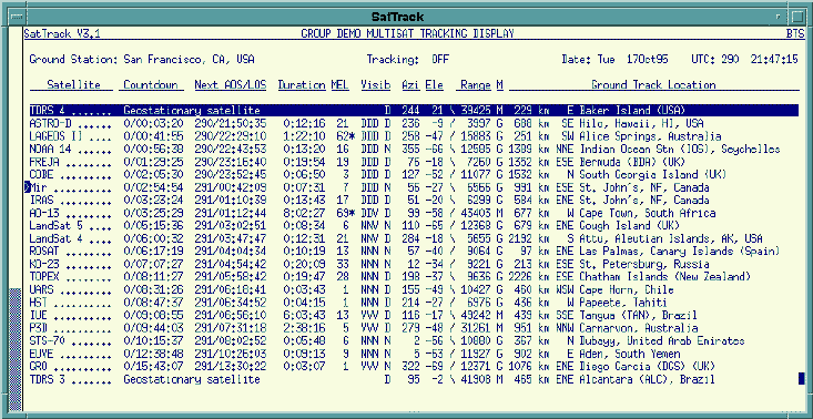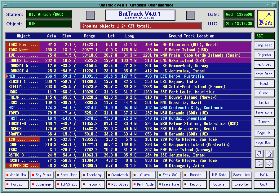 Users of SatTrack V3.1 include NASA's Jet Propulsion Laboratory (JPL), Johnson Space Center (JSC), Goddard Space Flight Center (GSFC) and Marshall Space Flight Center (MSFC), the European Space Agency (ESA), the German Aerospace Research Establishment (DLR), the National Aerospace Laboratory (NLR) of The Netherlands, the Los Alamos National Laboratory (LANL), the Amundsen-Scott South Pole Station, a large number of universities and other institutions, as well as thousands of private users all over the world.You can find more information about SatTrack, including its copyright and licensing information and the latest version of the SatTrack 3.1 distribution at http://www.primenet.com/~bester/sattrack.html.