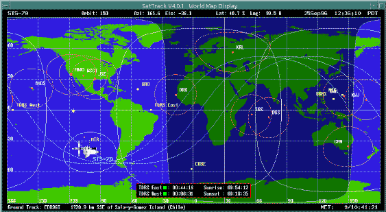 SatTrack is an absolute wonder for tracking satellites. With the help of SatTrack, I've made my first two-way communication with another ham radio operator over 1000 miles away using the Russian amateur radio satellite RS-15, and I look forward to making many more. Those who are not ham radio operators can find fun uses for SatTrack as well. Weather satellites, geological survey satellites, and others are constantly sending image and telemetry data to the earth. SatTrack can also tell you when satellites might be visible. Ever seen a space shuttle fly overhead? The Mir Space Station? The Hubble Space Telescope? With binoculars or a telescope, you might even see smaller satellites, once SatTrack has told you where and when to look. Doing a presentation on the Global Positioning System? Show your audience exactly where the GPS satellites are in orbit. Need a compelling computer display for that sci-fi epic you're producing for Film Studies 101? SatTrack can provide ever-changing graphic disply windows.