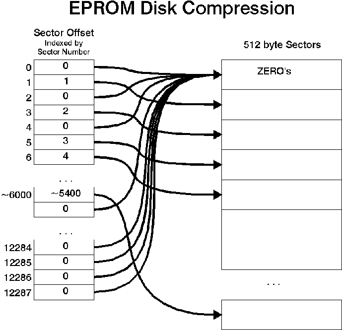 When deciding how to implement the EPROM device driver, the first idea was to create an image of a disk in the EPROM. This would provide a RAM disk of the same size as the EPROM, 3.5MB in this case (the DOS portion of the SSD takes 1/2 MB). Instead, to allow a larger RAM disk, a compressed disk image is used. The compression used is simple--any sectors which are identical are only stored once. The primary advantage this gives is blank areas of the disk image don't need to take up EPROM space. Listing 1 shows the SSD disk compression used.