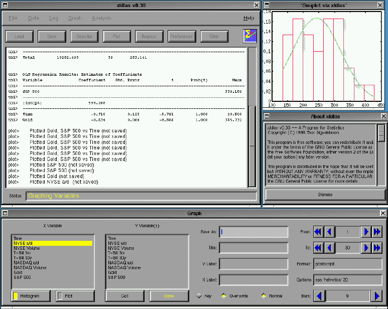 In addition to manipulating data and performing analysis, xldlas allows you to graph variables. All of xldlas's graphical output is actually performed by gnuplot, an application which is included in all major Linux distributions. Two graphing commands are implemented: Plot and Histogram. The former lets you create line and scatter plots, while the latter generates a histogram describing a variable's distribution. Both sorts of graphs can be titled and labeled, and they can be saved in any format supported by whatever version of gnuplot is installed on your system. In addition, you can set point and line styles, and the Histogram routine includes an optional feature which will superimpose a normal distribution with the same mean and variance as the data being graphed.
