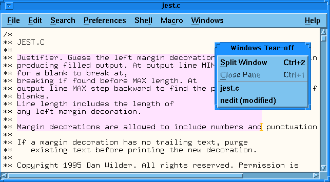 Ever struggle with some editor's notion of how a C comment block should look? Seems like nobody gets it quite right, and nobody handles all the oddball cases. Now, with NEdit, I can take a typical function header as in the illustration, and with just a few mouse clicks and keystrokes convert this into a much neater form.