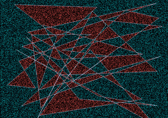 The test program (Listing 2) draws a random 40-sided polygon and then picks random points to throw at the inpoly() routine. Points the routine says are inside the polygon it draws red, points outside are blue.