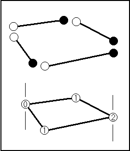The scheme for getting our faithful friend to count corner crossings correctly is to always count a crossing of the right end of each edge, but never the left end (right meaning positive X). In the figure, the black circles represent points our snail will count if he crosses; the white circles he won't count. When you put the polygon together, everything ends up the way we want. Nicking the corner means he counts either 0 crossings or two crossings. We don't care which; both are even and our snail knows he's outside. The circles with ones in them represent points counted once if the snail crosses them. This is fine, just like crossing the nearby sides.