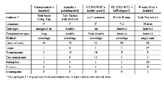 This is a pretty casual analysis of the algorithms. I certainly didn't shy away from showing my inpoly() in a good light. For example, && and || operators in C are often statements in disguise. I used one of these operators (as did most of the other folks), but that doesn't show up in the table at all. Also, some line counts are inflated slightly by comments and blank lines. But you get a rough idea.