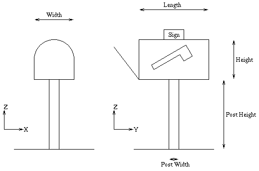 The amount of planning needed to build an image is directly related to its complexity. Complex images should be built in the same manner as a complex program--by first getting a broad outline to work, and then filling in the details. In our case, the mailbox is fairly simple. We define the z direction to be height above the ground, which is at z=0. The post the mailbox rests on will be located at x=0 and y=0 to make things easy. See Figure 1 for a simple plan of the mailbox.