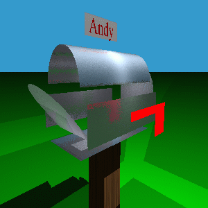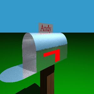 object { mb_top translate < 0.0, 0.0, MB_HEIGHT/2.0 > } object { sign scale 0.9 rotate <90, 0, -90> translate <0, 1.5, MB_HEIGHT> } object { mb_flag rotate <-90*clock, 0.0, 0.0> translate < 0.01+MB_WIDTH/2.0, MB_LENGTH/2.95, MB_HEIGHT/2.25 > } texture { pigment { color Silver } normal { bumps 0.1 scale 0.01 } finish { ambient 0.2 brilliance 6.0 reflection 0.5 } } translate < 0.0, 0.0, POST_HEIGHT> }The last section places the mailbox's top, sign and flag into place. The final texture keyword is used to give a texture to all the surfaces that don't have one yet--surfaces that already have textures are unaffected. The brilliance parameter controls how light reflects from the surface as a function of the angle at which it strikes the surface. Higher values make the surface appear more metallic, which is what we want. The reflection keyword causes reflection to occur, with 1.0 being a mirror surface and 0.0 being a black non-reflective surface.